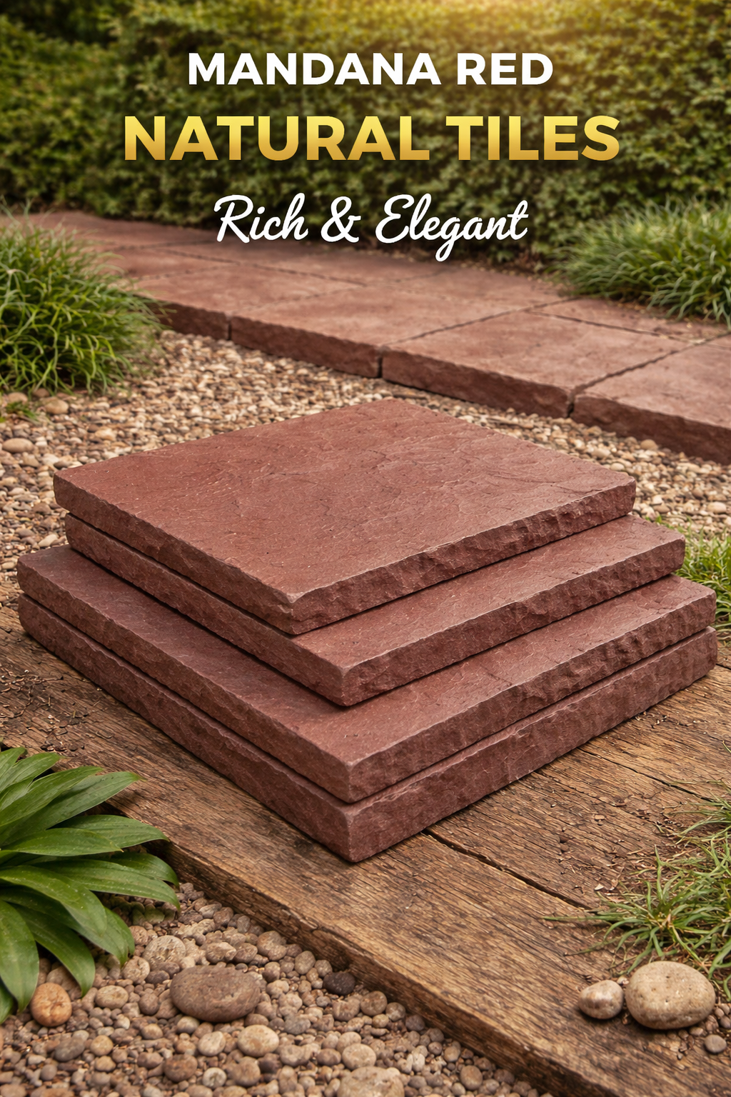 Mandana red natural tiles features irregular shapes and rich natural textures, ideal for rustic patios, garden paths, and outdoor flooring. Strong and weather-resistant, it creates a timeless, natural look while ensuring durability and slip resistance in residential and commercial landscapes.