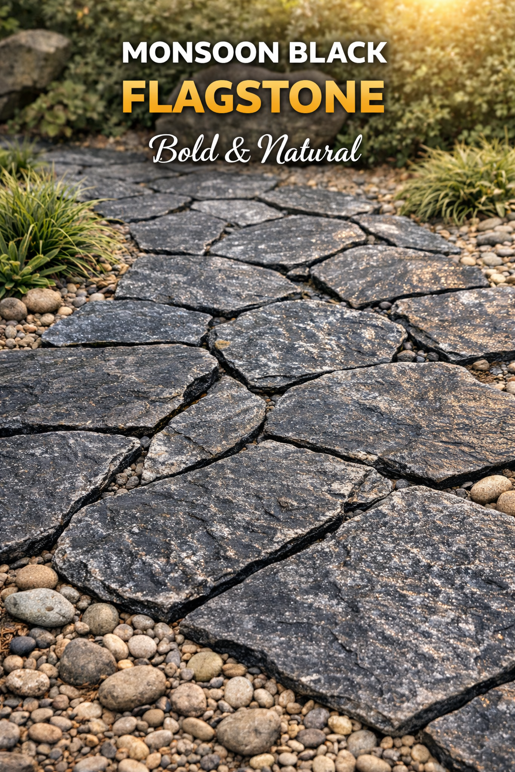 Monsoon black flagstone features irregular shapes and rich natural textures, ideal for rustic patios, garden paths, and outdoor flooring. Strong and weather-resistant, it creates a timeless, natural look while ensuring durability and slip resistance in residential and commercial landscapes.